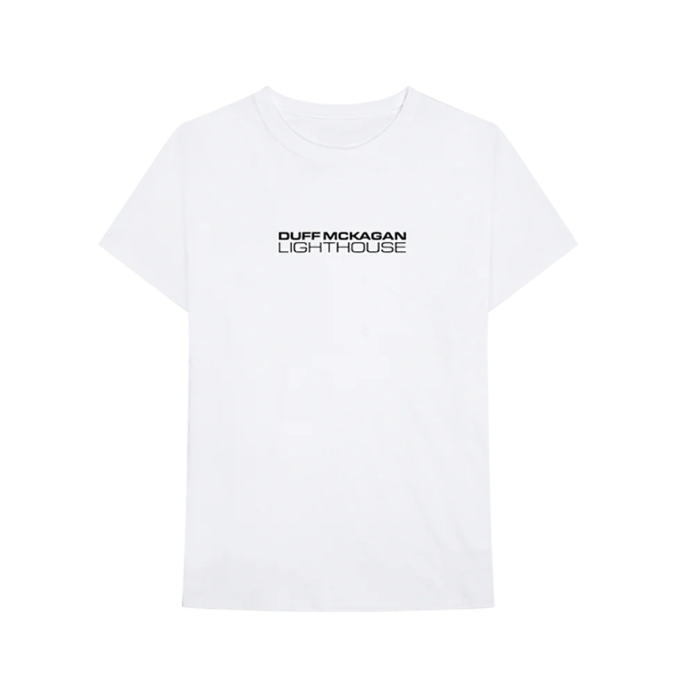 White short-sleeve t-shirt with "Duff McKagan/Lighthouse" text printed on the front, featuring sketched lighthouse imagery on the back.