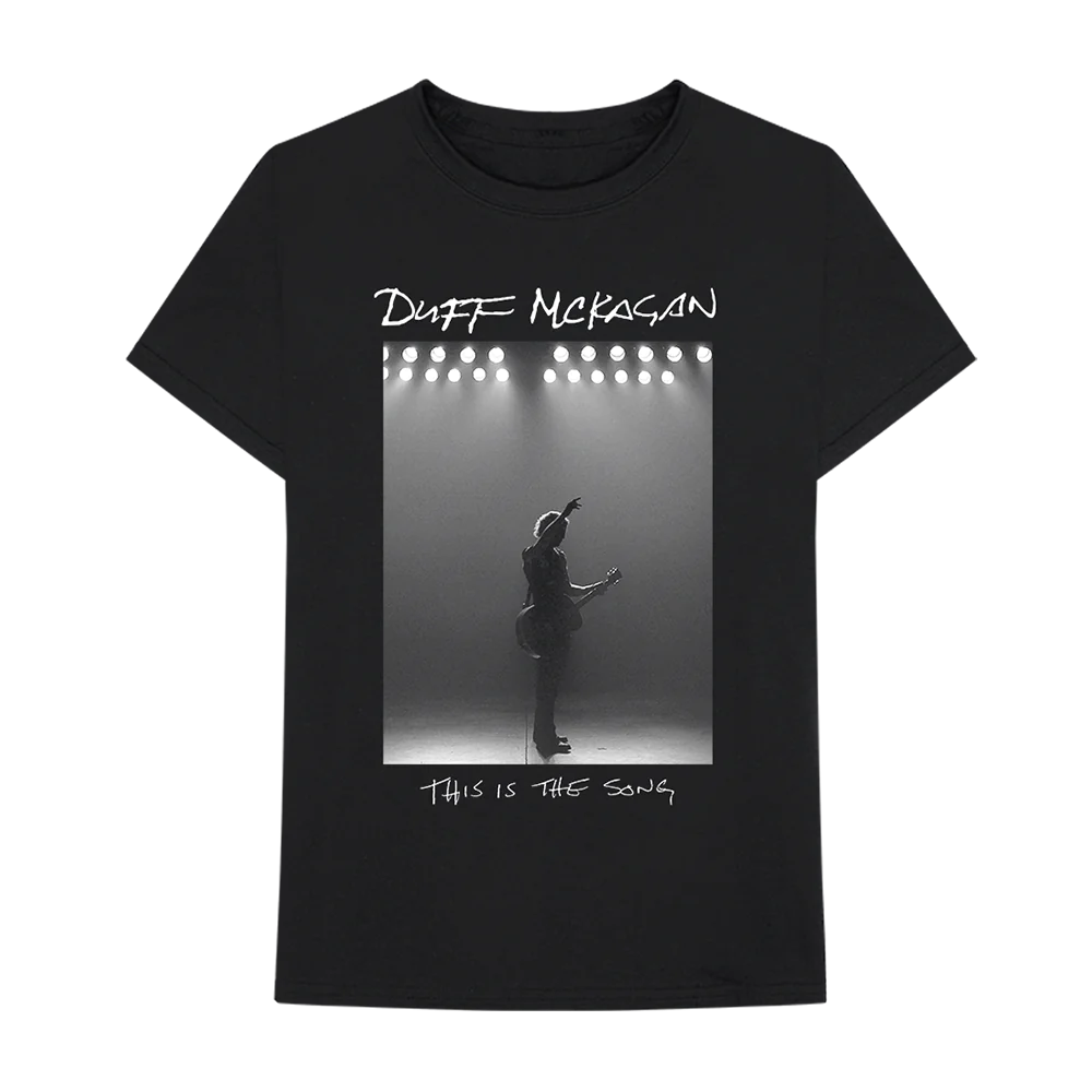 Soft black short sleeve t-shirt featuring a photo of Duff and 'This Is The Song' printed on the front. Lyrics "Come Along With Me We’ll Get Stronger" printed on the back.
